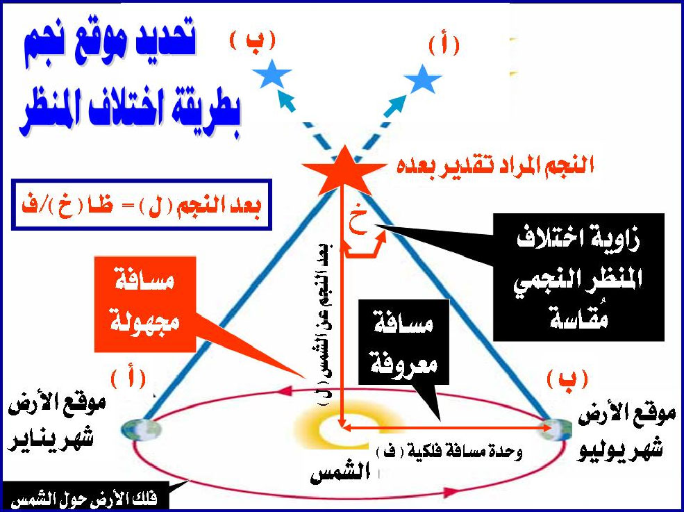 وتتم هذه العملية بقيام الفلكي برصد النجم مرتين تفصل الرصدة الثانية عن الرصدة الأولى بستة أشهر بحيث يكون الراصد على طرفي قطر مدار الفلك الأرضي حول الشمس. المثلث المتحصل من الخط الذي يمثله قطر الفلك المار بالشمس كمركز له والخطان الواصلان بين طرفي هذه القطر (قاعدة المثلث) والنجم المرصود (رأس المثلث) تكون زاوية رأسها النجم المرصود. نصف هذه الزاوية التي يحددها العمود الساقط من النجم على منتصف القطر تسمى اختلاف المنظر النجمي (خ) وترتبط بمسافة النجم (ل) بالعلاقة خ" {بالثواني القوسية}= ل/1 حيث ل هي المسافة التي تتحدد عندما تساوي زاوية اختلاف المنظر ثانية واحدة أو 3600/1 درجة. وهذه المسافة تسمى "بارسيك" (Parsec) وتساوي 3.26 سنة ضوئية.