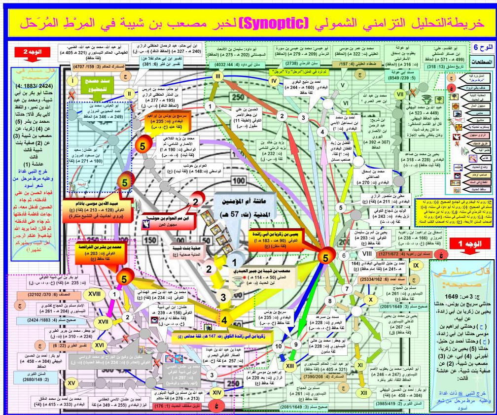 وقد قمنا من أجل تقريب الأمر إليك وإلى باقي القراء بتخريج خبر "المِرط المُرَحّل" في اللوح 6 المقابل ورسمنا خريطته التزامنية الشمولية عبر الزمن، ولخصنا فيها أقوال أصحاب الجرح والتعديل في كل راو راو، ليسهل عليك أولا تتبع تنقل الخبر عبر الزمن، ولحقبة تاريخية تناهز الخمسمائة سنة (500 سنة) أحياناً، ثم لتستطيع أن تحكم على الخبر تلقائياً من خلالها، مع توضيح ما يمكن أن يشكل عليك في مثل هذا الفهم المتبادر، إن دعت إليه الضرورة.